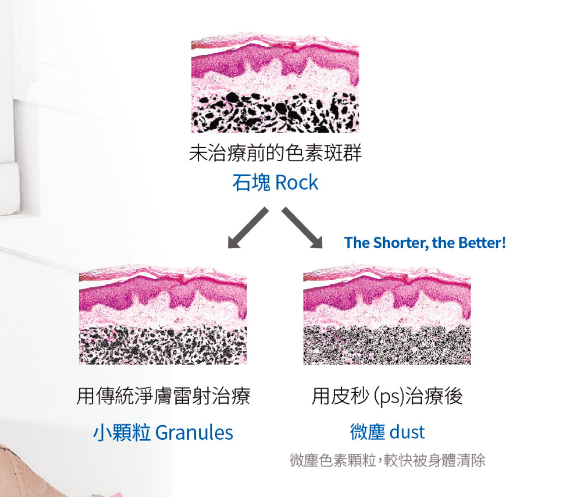 皮秒雷射的「皮秒(picosecond)」是一種時間單位,可在短脈衝時間內產生強大的光震波。時間越短,熱能越少,而能量更強,所以皮秒雷射擁有「超短脈衝時間」的優勢。不但能高效的破壞皮膚的色素與斑點,將色素擊碎成細小的粉塵使其更容易代謝,又不會過度產生熱能,解決了以往傳統雷射易對皮膚造成的熱傷害。