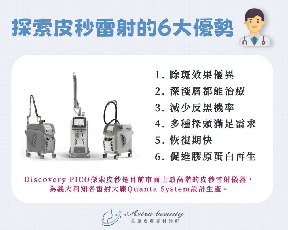 皮秒雷射的優點是:恢復期短、效果佳、照顧較容易。星麗皮膚科所採用的探索皮秒雷射更是號稱「皮秒界的超跑」,具不易反黑、皮膚深淺層都能治療的超級優勢!